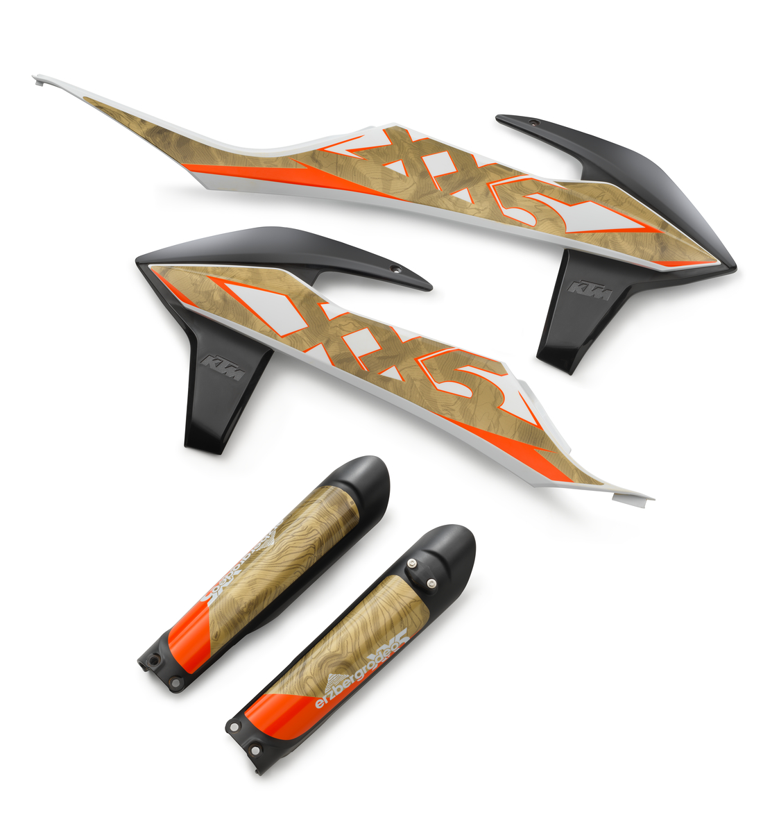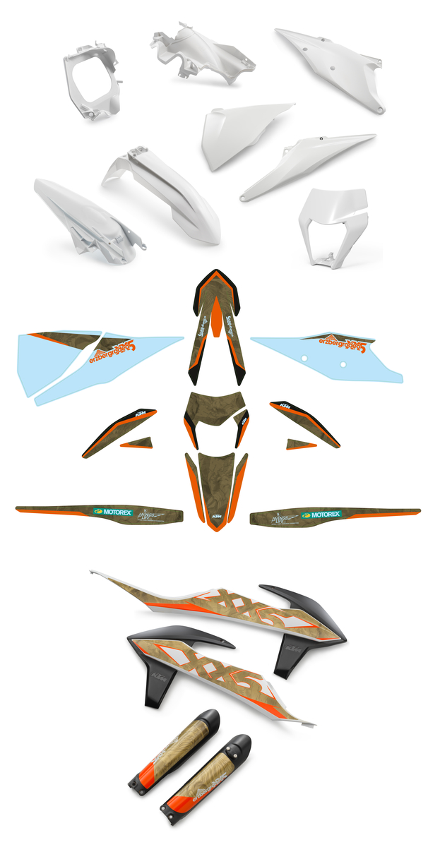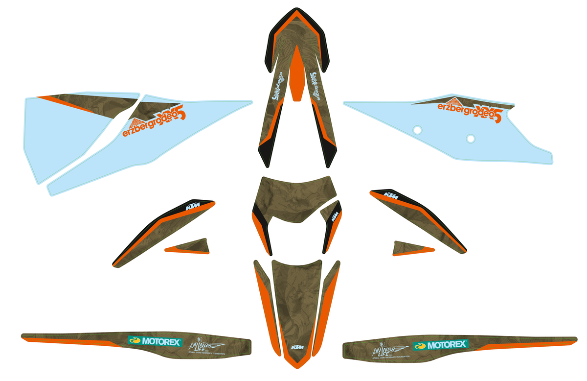consists of: Graphics kit Erzbergrodeo, Fork protector, spoiler set, tail section, air filter box, air filter box front part, air filter cover (RH, LH), fender, headlight mask